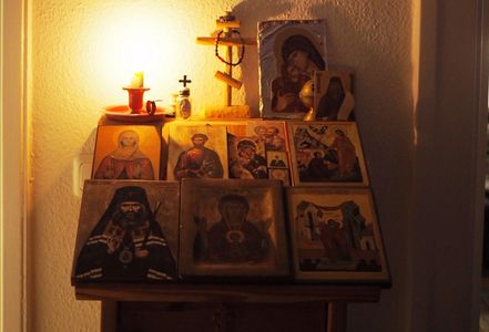 Als zentralen Ort für das Familiengebet ist es üblich, eine Ikonenecke zu schaffen. Diese sollte wenn möglich gen Osten gerichtet sein. Zu bedenken ist, dass es für Christen, die aus der protestantischen oder evangelikalen Tradition kommen, manchmal eine Überwindung kostet, Ikonen aufzustellen und zu verehren. Hier könnte man vielleicht zuerst klein anfangen und nur eine Ikone aufhängen. Die Ikonenecke wächst ohnehin im Laufe der Zeit mit Ikonen und anderen Gegenständen (wie Kerzen, Weihrauchgefäßen, heiligem Öl etc.), die Bedeutung für die Familie haben und/oder geschenkt wurden. Neben der Hauptikonenecke, die z.B. auch auf einem einfachen Brett oder Regalbrett aufgebaut werden kann, bietet es sich an, auch eine kleine Ikonenecke im Kinderzimmer aufzubauen/aufzuhängen mit Ikonen der Namensheiligen, einem Kreuz und einer Christus- und einer Gottesmutterikone und sonstigen geliebten Heiligen der Kinder. Wir z.B. haben uns für ein Brett am Bett entschieden, auf dem Ikonen liegen und stehen, die in die Hand genommen und geküsst werden können. Alternativ kann man auch an der Hauptgebetsecke einige Ikonen auf Augenhöhe der Kinder aufhängen.